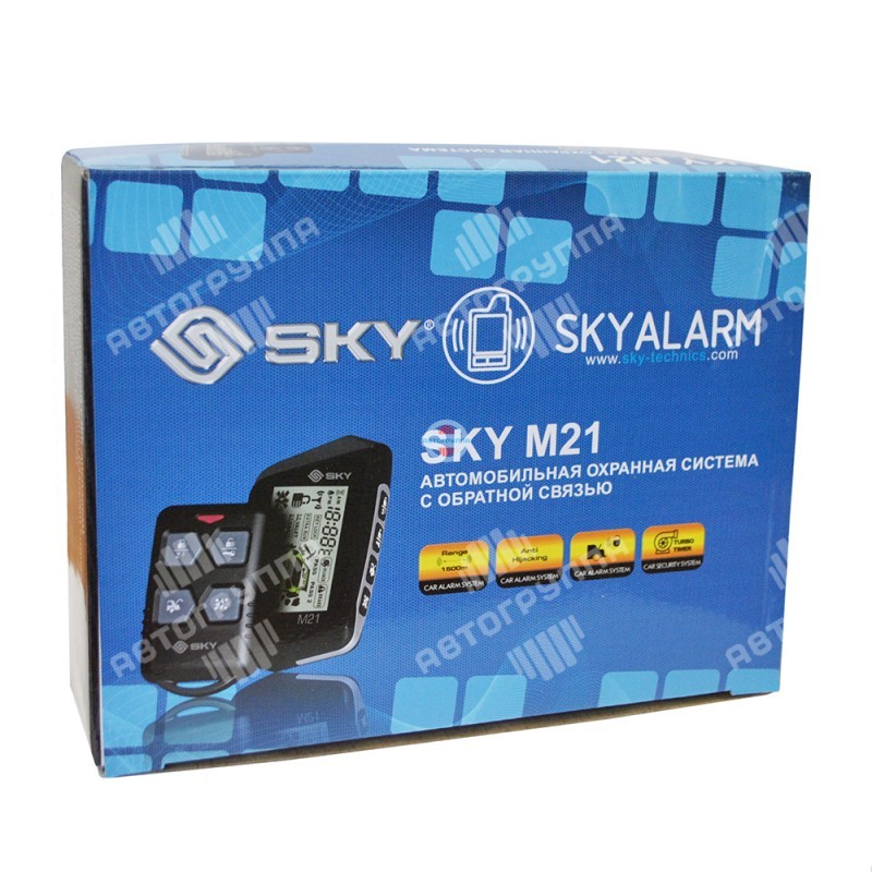 Автомобильная сигнализация Sky M21 с обратной связи. В комплекте два брелка (односторонний и двухсторонний) с дальностью приема и управления 1200 м. Управление дверьми, багажником, стеклоподъемниками.