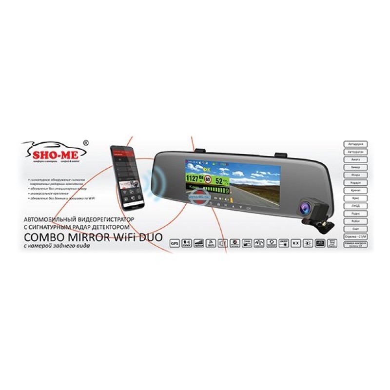 Автомобильный регистратор с радар-детектором Sho-Me Combo Mirror WiFi DUO. Устройство в виде зеркала с 7-дюймовым дисплеем. В комплекте камера заднего вида с разрешением записи 1280 х 720 р. Комбинированное устройство работает на процессоре MStar 8339. Матрица PS5260, угол обзора 136°.