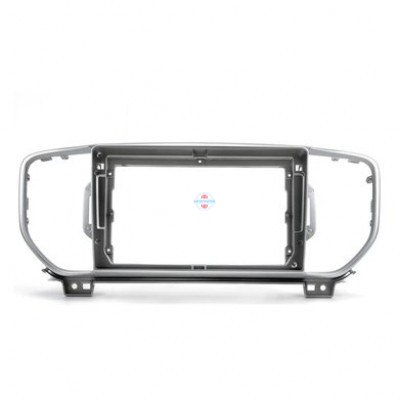 Переходная рамка серебристого цвета, разработанная для автомобилей Kia Sportage и KX5 модельного ряда 2015-2018 годов, предназначена для мультимедийных систем с диагональю 9 дюймов.