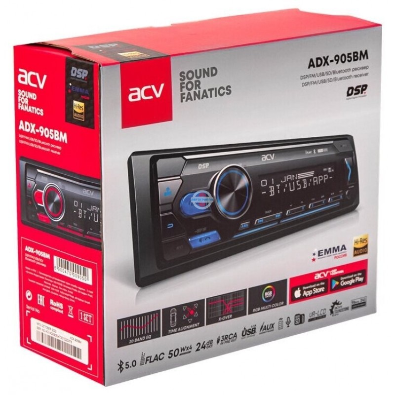 Ресивер с высокопроизводительным звуковом процессором оригинальной разработки ACV Soundstone DSP-SS1 и 3 парами 4 вольтовых RCA аудиовыходов. Оснащен встроенным усилителем с максимальной мощностью 4х50 Вт. Поддержка FLAC 24bit 96kHz.