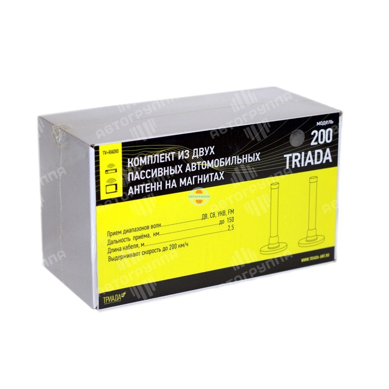 Купите комплект наружных антенн Триада-200, которые принимают как радио, так и ТВ-сигнал. Стоит отметить, что антенны обладают магнитным основанием, что позволяет им крепко удерживаться, если скорость автомобиля достигает 200 километров в час. Дальность приема антенн составляет до 150 километров. Антенны предназначены для установки на заднюю часть автомобильной крыши (при этом, одна антенна включает в себя радиоштекер, а другая – телевизионный).