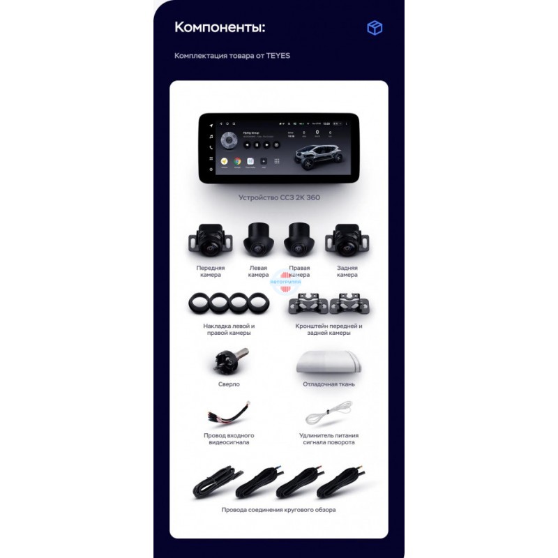 Автомагнитола-планшет, рамка, электронная инструкция, схема подключения проводов, Антенна GPS, Антенна 4G, салфетка, отвёртка и шурупы, провода аудио и видео, USB-кабель, комплект камер кругового обзора (4 шт.), сверло, отладочная ткань, накладки и крепления, провод входного видеосигнала, провода соединения кругового обзора, удлинитель питания сигнала поворота.