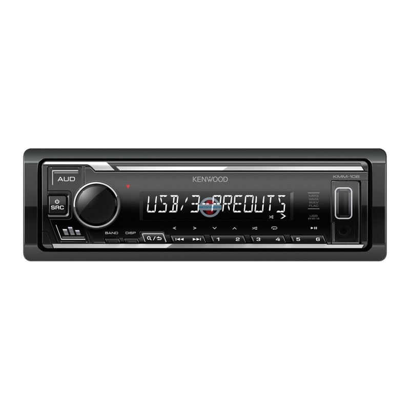Автомобильный проигрыватель Kenwood KMM 106 типоразмером 1DIN без CD-привода. В комплекте есть пульт управления. Съемная передняя панель для предотвращения кражи устройства из автомобиля. Белая подсветка с приглушением яркости, ЖК-дисплей. USB 2.0, AUX, кнопка настроек, трехполосный эквалайзер.