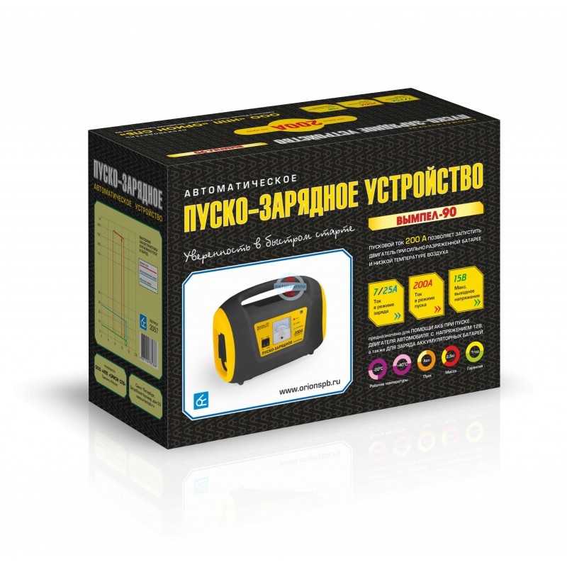 Вымпел 90 от компании НПП Орион СПб для заряда автомобильных аккумуляторов (12 В) любой емкости. Зарядный ток устройства 7 А, форсированный заряд 25 А. Заряжает полностью разряженную АКБ. Можно использовать в качестве пускового и предпускового устройства с максимальным током 200 А.