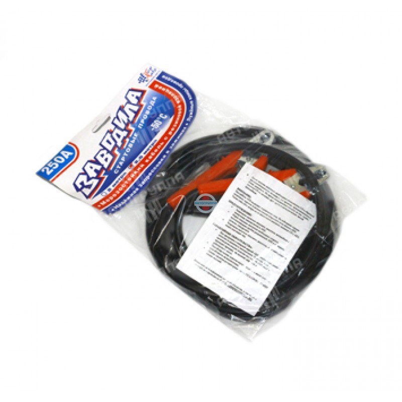 Стартовые провода Заводила 250А предназначены для подпитки стартера автомобиля с разряженной аккумуляторной батареей от автомобиля донора путём соединения одноименных клемм.