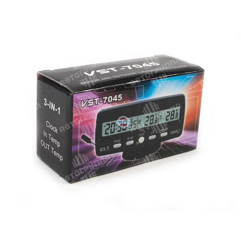 VST 7045 – это автомобильный термометр, способный демонстрировать температуру внутри и снаружи автомобиля. Его датчики ведут измерения в диапазоне от -10 ? до +50 ? с точностью до ± 1,0 ?. VST 7045 будет обновлять данные о температуре каждые 60 секунд и показывать их на дисплее с синей подсветкой. Помимо всего вышесказанного, VST 7045 будет демонстрировать вам текущие дату, время и день недели. Так же данное устройство обладает встроенным будильником и функцией Snooze продолжительностью 8 минут. VST 7045 способен питаться от автомобильной сети через прикуриватель либо от двух батареек AG13.